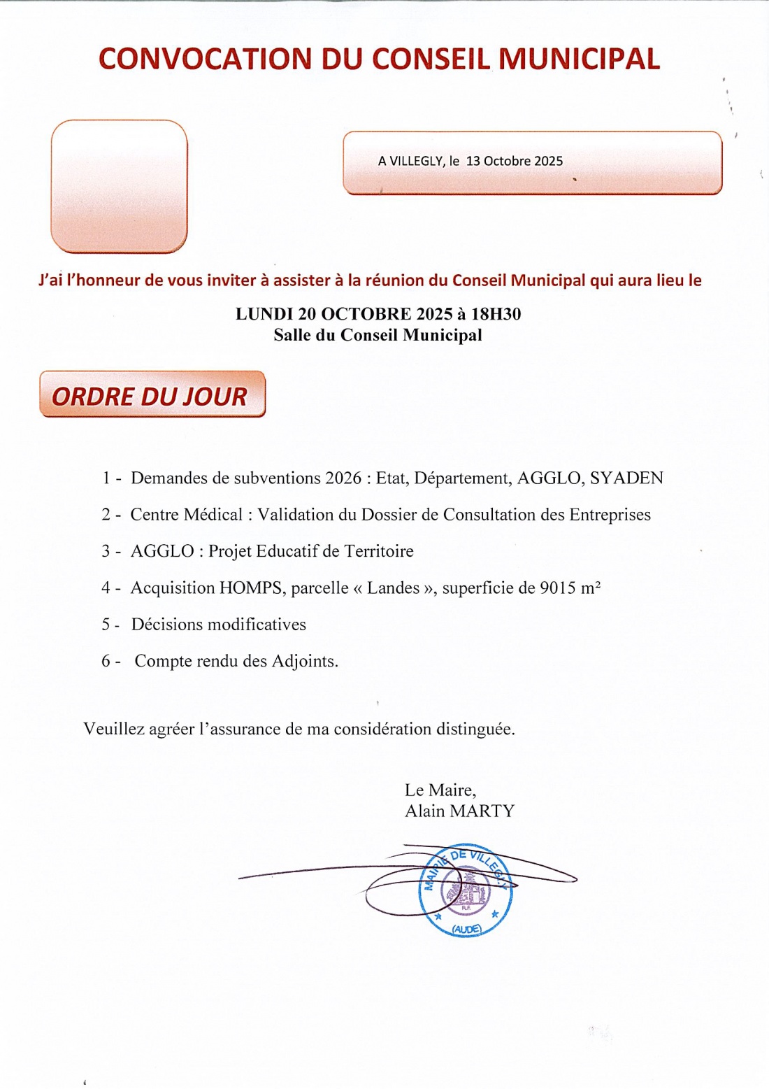Siège Social : Mairie - 92 avenue du Minervois - 11600 VILLEGLY
