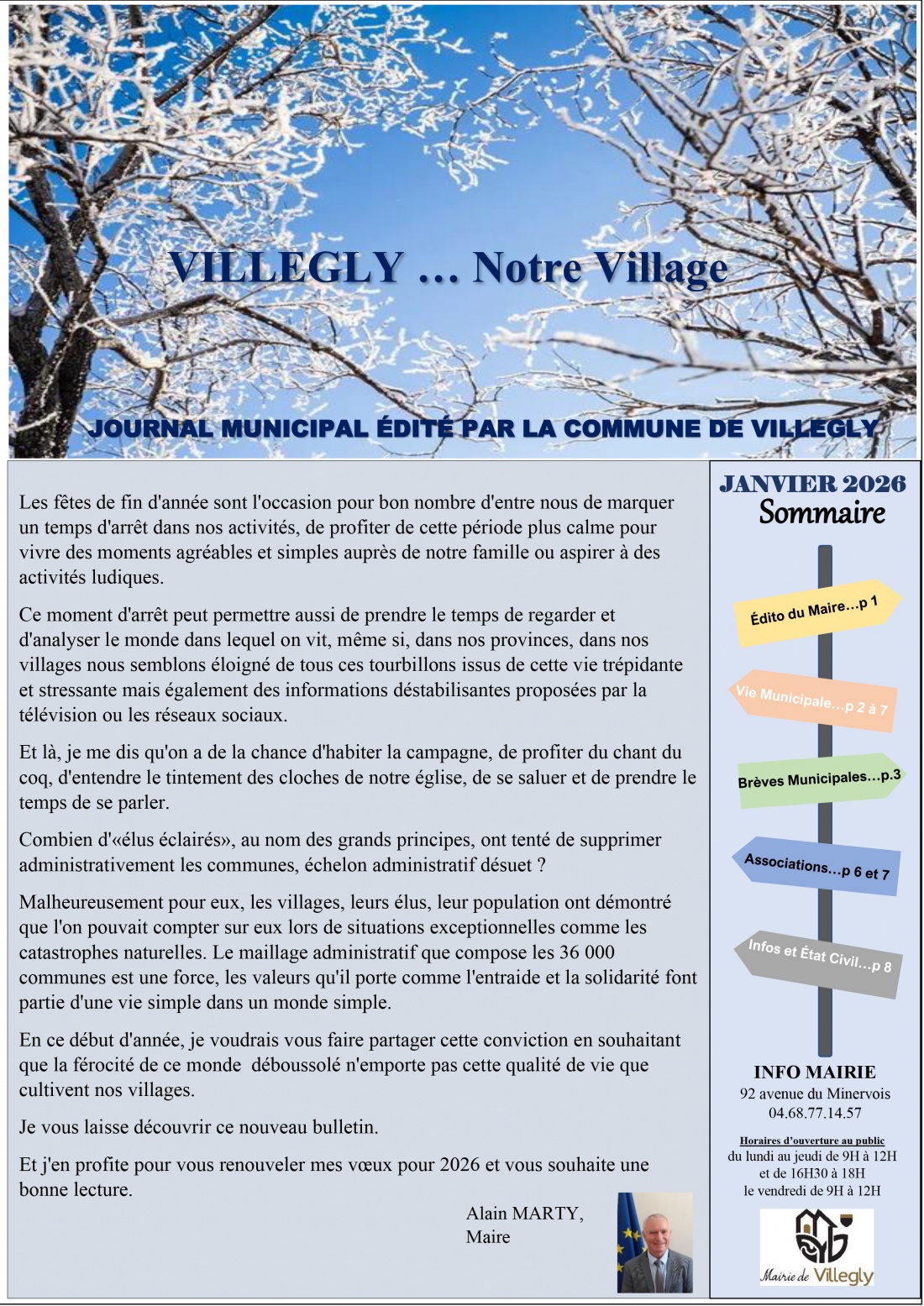 Le bulletin municipal N° 33 du mois de janvier 2026 est disponible sur notre site internet à la rubrique "Pratique" "bulletins municipaux", Pour ceux qui ne possèdent pas internet, des exemplaires format papier sont disponibles au secrétariat de mairie. Bonne lecture à tous !